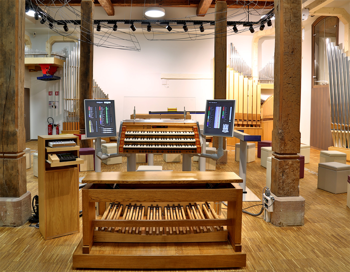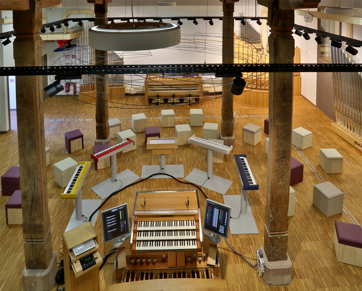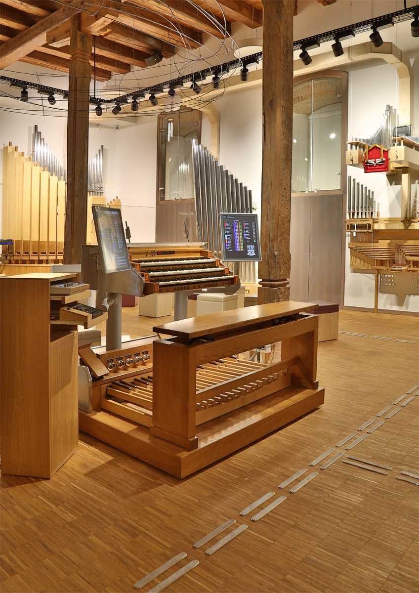 Die 30 Klangfarben der Orgelanlage werden auf Klanginseln präsentiert, die ringsum in der Halle verteilt sind. Von einem modernen 3-manualigen Spieltisch mit zwei Touchscreens lassen sich die Klangeffekte steuern.